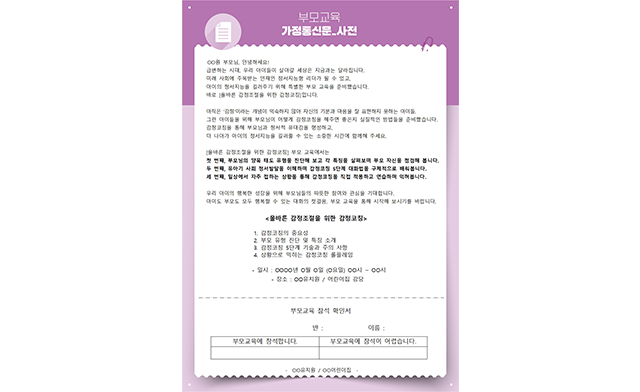 부모 유형 TEST를 통해 아이를 대하는 부모님의 대화 유형을 파악해 보고, 유형별 특징을 살펴보며 부모 자신을 돌아보고 점검해 보는 시간을 가집니다.