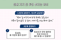아이가 자신의 감정을 올바르게 조절하고 표현하는 방법을 감정코칭 5단계로 알려드리고 당장 실천할 수 있게 일상 사례를 통해 실제 연습해 보며 익히는 시간을 갖습니다.