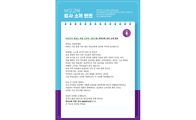 “성교육은 학교에 들어가고 난 뒤에 시켜도 늦지 않을거라 생각했는데, 오늘 교육을 통해 가정에서부터 성교육이 자연스럽게 이루어져야 한다는 걸 알게 됐어요.”
