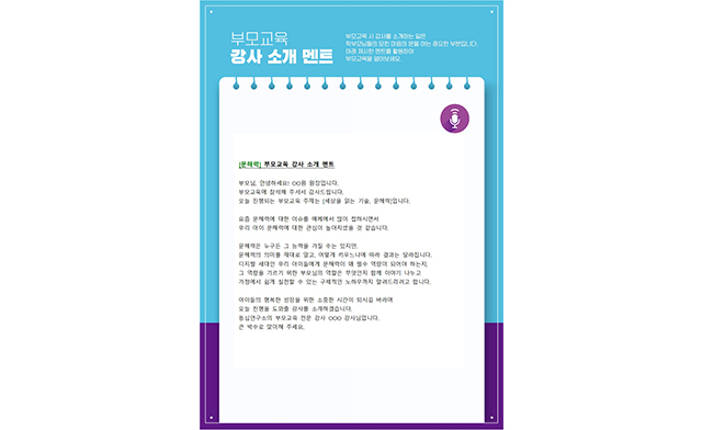 OOO엄마“가끔 ‘학생들이나 성인들이 이런 단어도 모른다’라는 기사를 접할 때마다 ‘우리 아이도 그럴 수 있겠다’는 우려가 있었는데 시기적절하게 강의를 듣게 되어 다행입니다. 특히 그림책을 읽어주고 있는 방식에 다시금 돌아보며, 부모인 제가 어떤 영향을 아이에게 주고 있었는지 스스로에 대한 격려와 함께 또 다른 다짐을 하게 되었어요.”