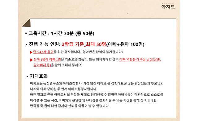 다른 아빠들과 소통하고 교감하는 시간을 통해 참여에 대한 만족감을 높이고 원에 대한 신뢰감을 이끌어냅니다.