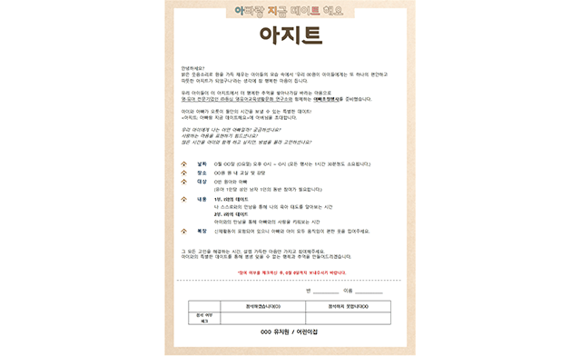 이지*아버님“우리 아이 친구의 아빠들을 만날 기회가 거의 없는데 원 행사에 참여해서 함께 하니 좋네요.앞으로도 자주 이런 시간 만들어주세요. 선생님들 모두 감사합니다.”