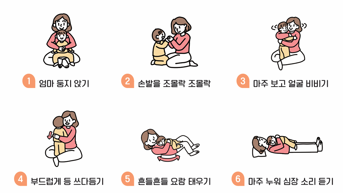 그중에서도 피부로 직접 느껴지는 접촉은 아이에게 가장 빠르고 강하게 안정감을 전해주는 방법이에요.