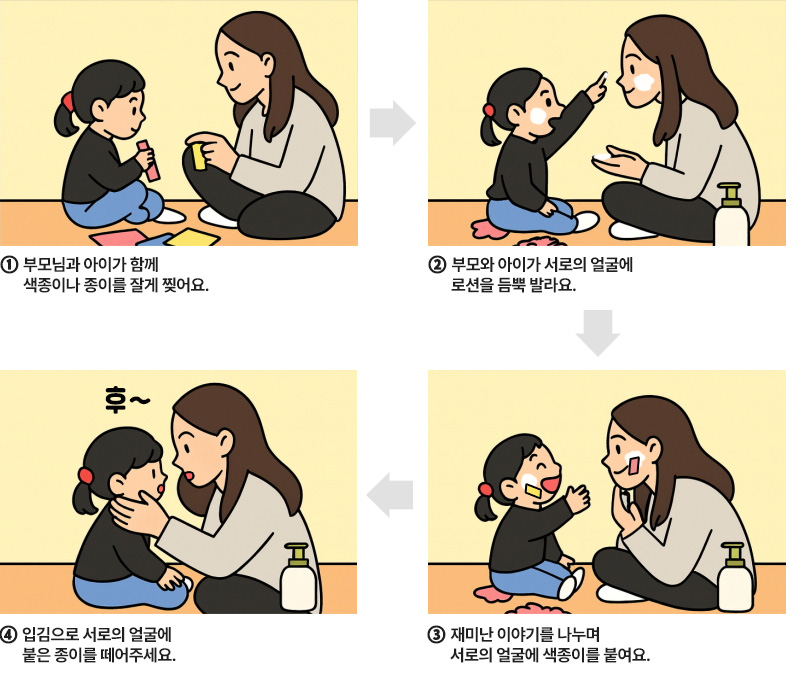 새로운 느낌으로 눈 맞춤과 스킨십을 할 수 있는 놀이입니다.